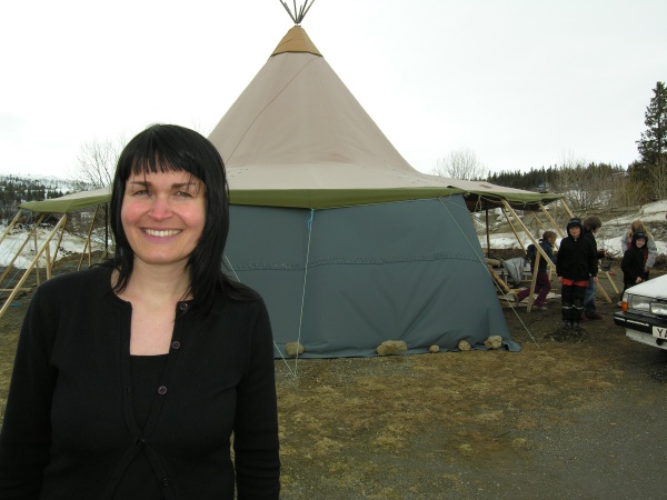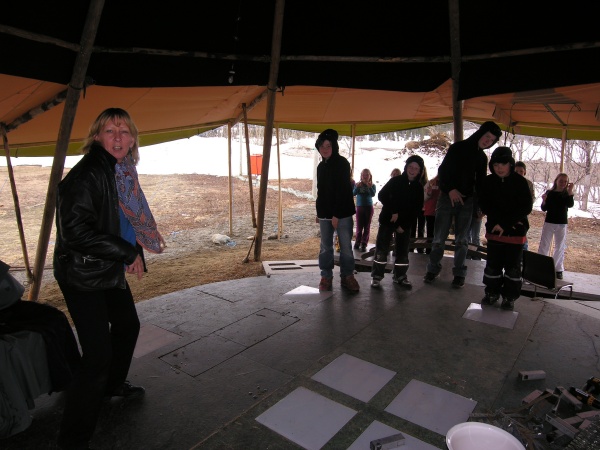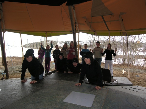 Jerven øver på dansen sin i lavvoen: Toamma Thomasson, Næjla Jåma, Tommy Steinfjell Gundersen og Per Arve Finvold. I bakgrunnen står reinen og ser på. Fra venstre: Frøya Vildem, Ylva Vildem, Maiken Mia Steinfjell Gundersen, Andrea Elise Bjørge Hanken, Ann Karolin Skjellhaug, Anette Devik, Anna Malena Gjefsjø og Ingunn Staldvik Svestad.